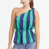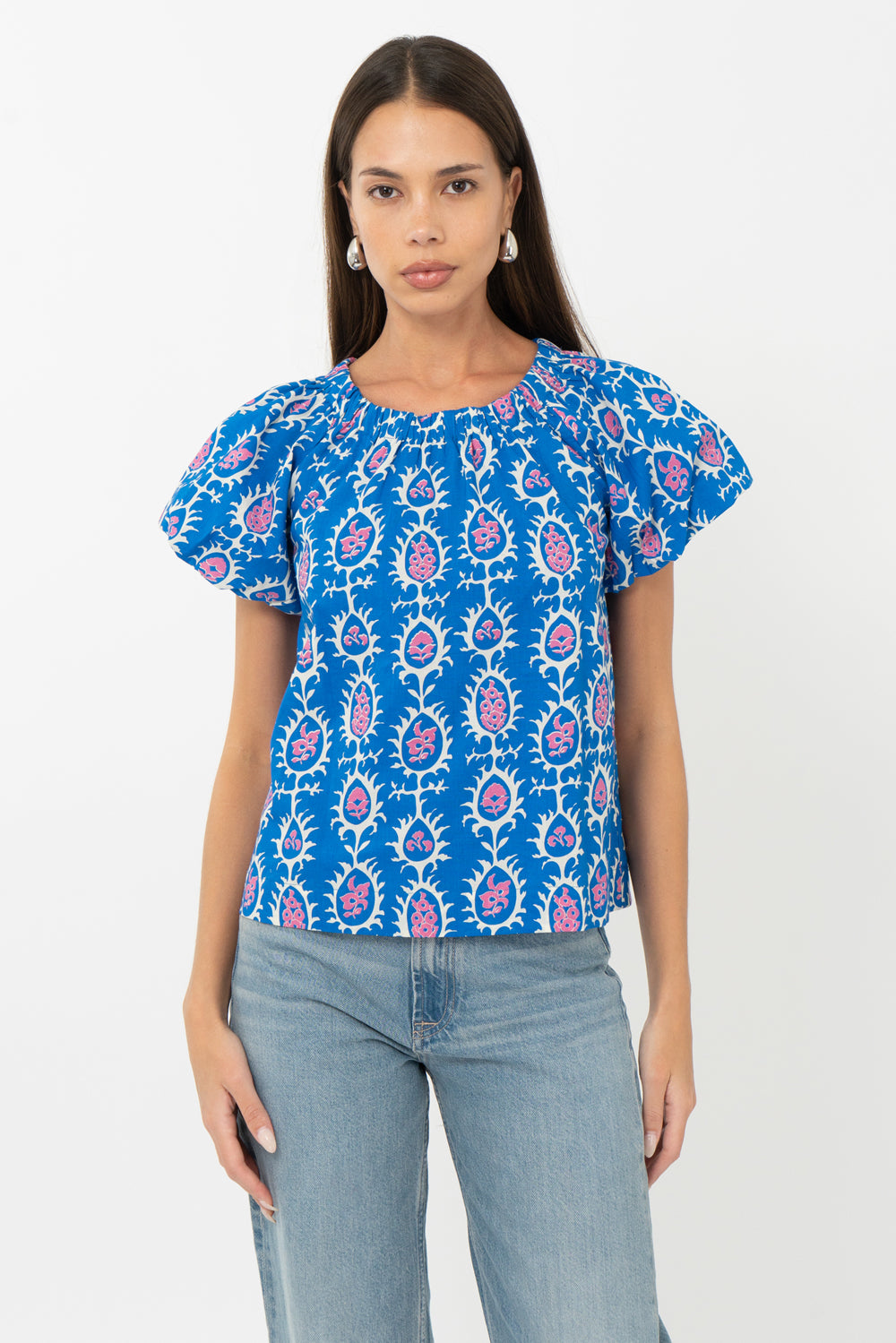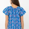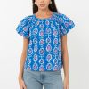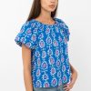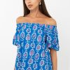 Blue top rendered in a pink and white print. The garment features an elasticated neckline that can be styled as an off shoulder piece.