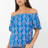 Blue top rendered in a pink and white print. The garment features an elasticated neckline that can be styled as an off shoulder piece.