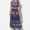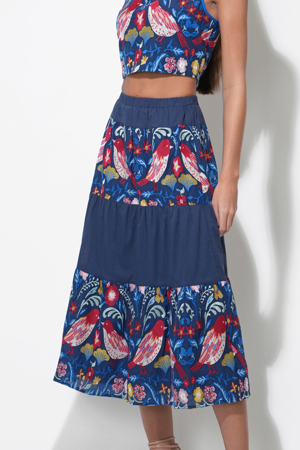This delightful midi skirt features a vibrant bird and floral print in a rich palette of blues, reds, and greens, accented by a contrasting solid blue tiered panel. The comfortable elasticated waist ensures a perfect fit, while the flowing tiered silhouette adds graceful movement. Perfect for creating a effortlessly stylish look, this skirt combines intricate embroidery with a relaxed, comfortable design.