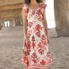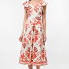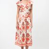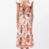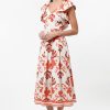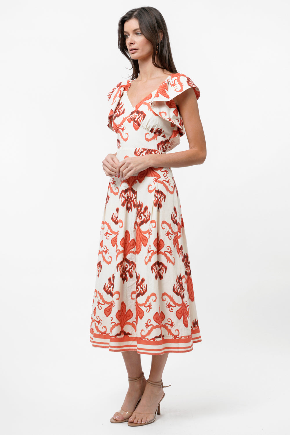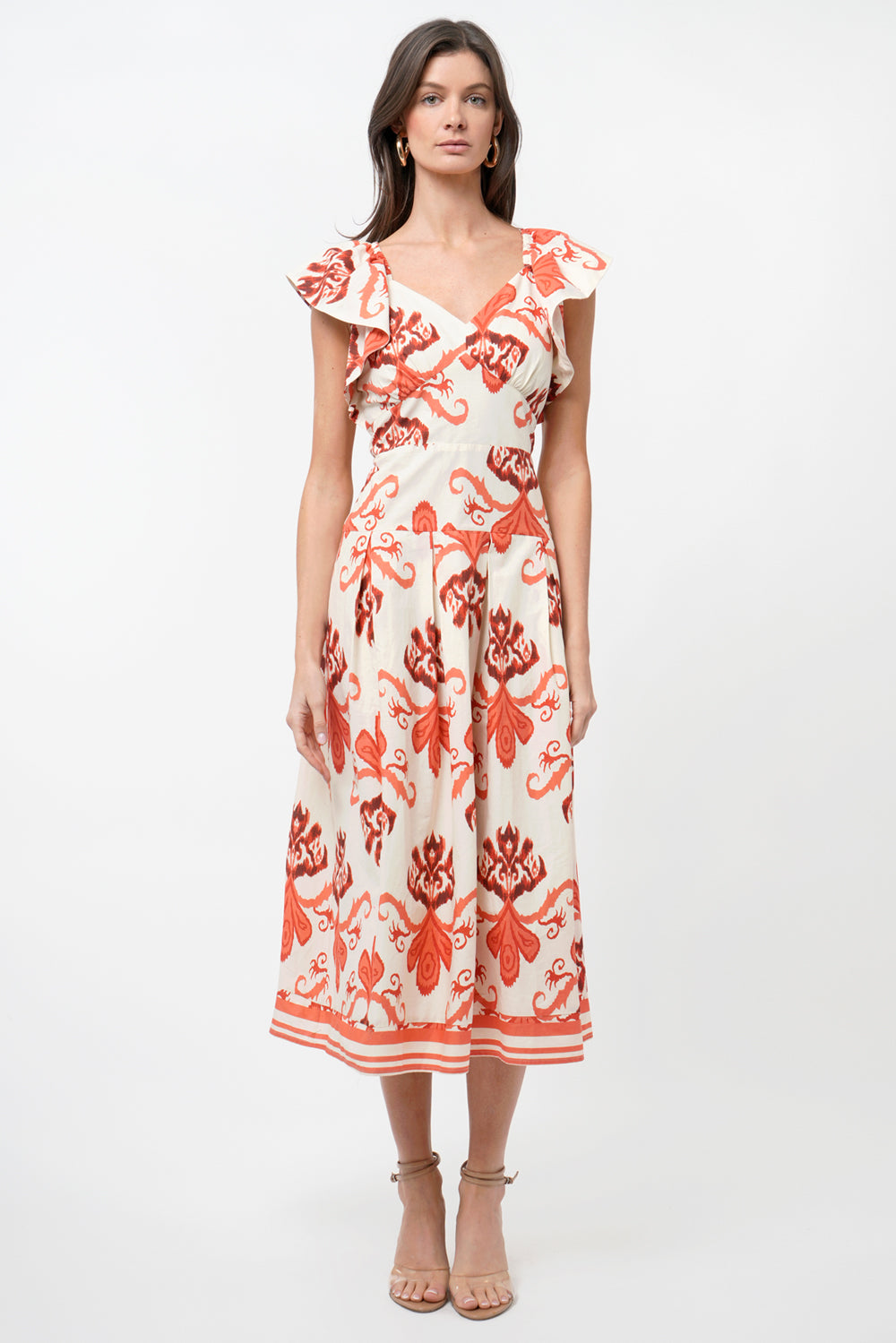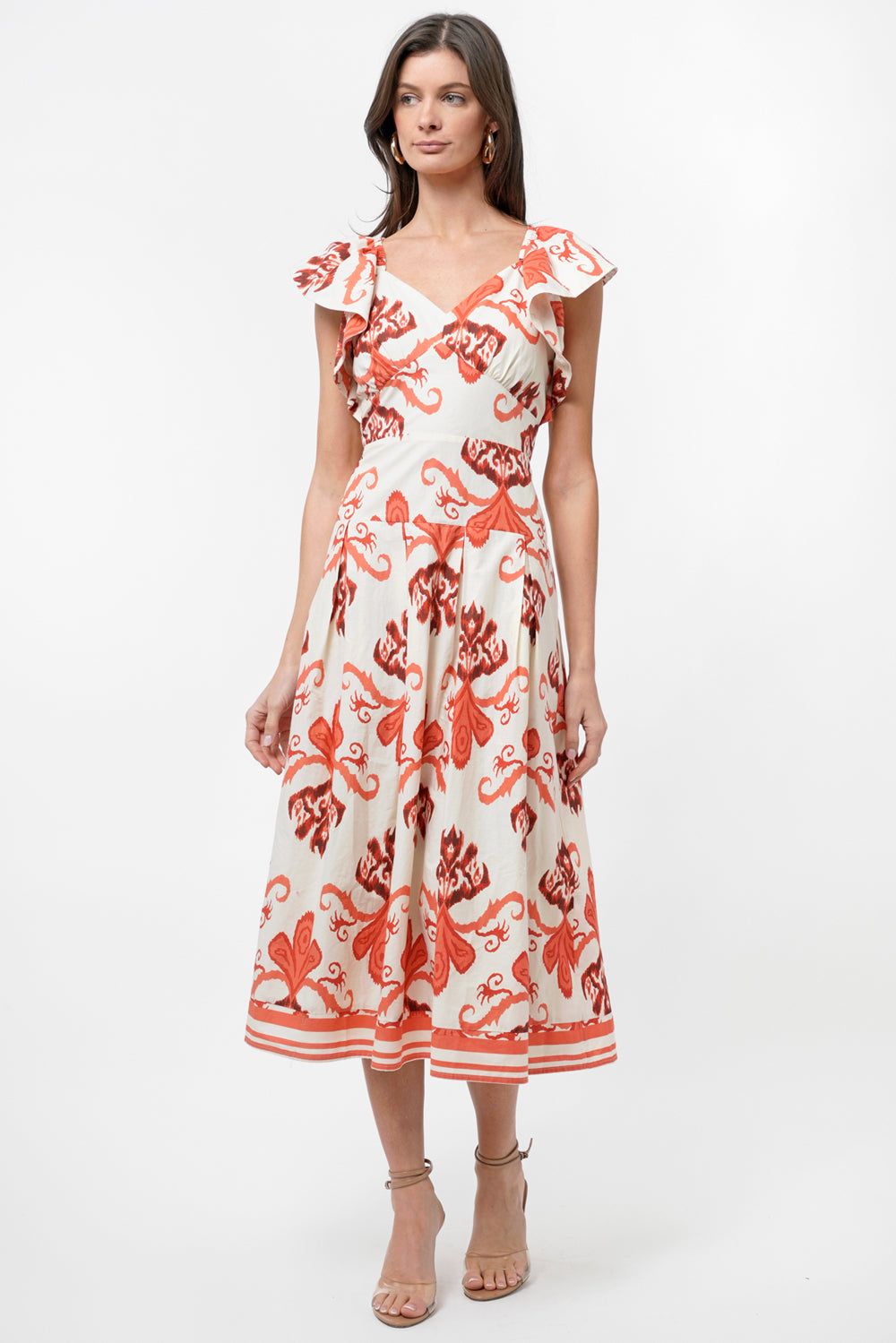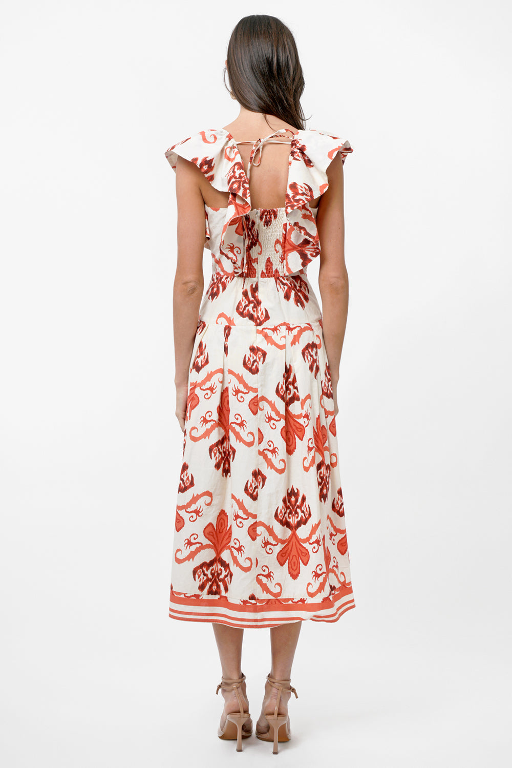 A dress made for sun-soaked days and golden hour moments. The Rosa Midi Dress features a vibrant red-and-ivory print, fluttery ruffle straps, and a fitted bodice that flows into a breezy A-line skirt. A smocked back with an adjustable tie adds comfort and shape, while the bold pattern gives a nod to getaway style with a polished twist.