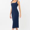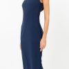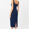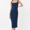 This classic midi dress boasts a bodycon shape with intricate lace detailing along the sides. A back slit and square neckline finish the design.