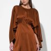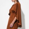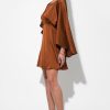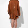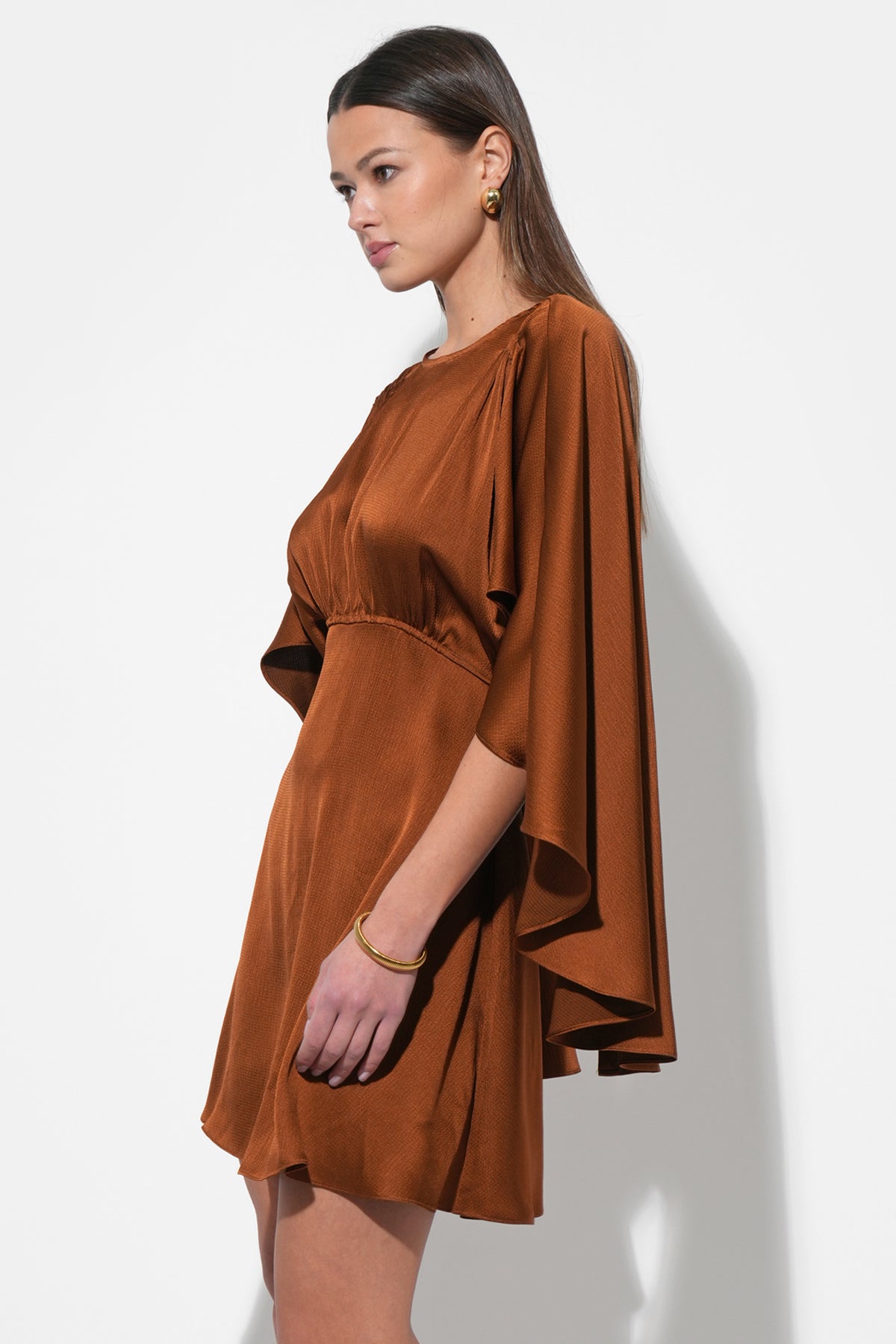 This elegant mini dress, in a rich toffee hue, offers a unique and modern silhouette. It features a sleek, high neckline and a dramatic cape overlay that drapes gracefully over the shoulders and down the back, creating a fluid and memorable look.