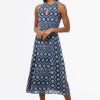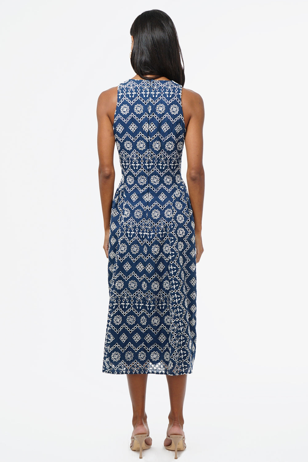 The Soraia Dress blends structure with softness in a navy cotton eyelet fabric, sculpting the waist and skimming the body with just the right amount of movement. The high neckline with a keyhole cutout adds a touch of drama, while the A-line silhouette keeps it wearable and refined.