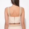 This charming top in a delicate blush or sand hue features intricate embroidery in a contrasting natural tone across the bust, creating a beautiful and unique pattern. Designed with comfortable wide straps that boast a braided texture, this top offers a modern square neckline and a flattering cropped length.