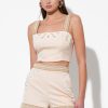 This charming top in a delicate blush or sand hue features intricate embroidery in a contrasting natural tone across the bust, creating a beautiful and unique pattern. Designed with comfortable wide straps that boast a braided texture, this top offers a modern square neckline and a flattering cropped length.