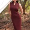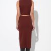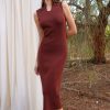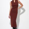 This elegant midi dress is crafted from a luxurious, figure-sculpting ribbed knit fabric in a rich chocolate brown hue, offering both comfort and a sleek silhouette. It features a contemporary high neckline and striking cut-out details at the waist, adding a modern and alluring edge.