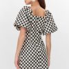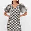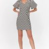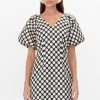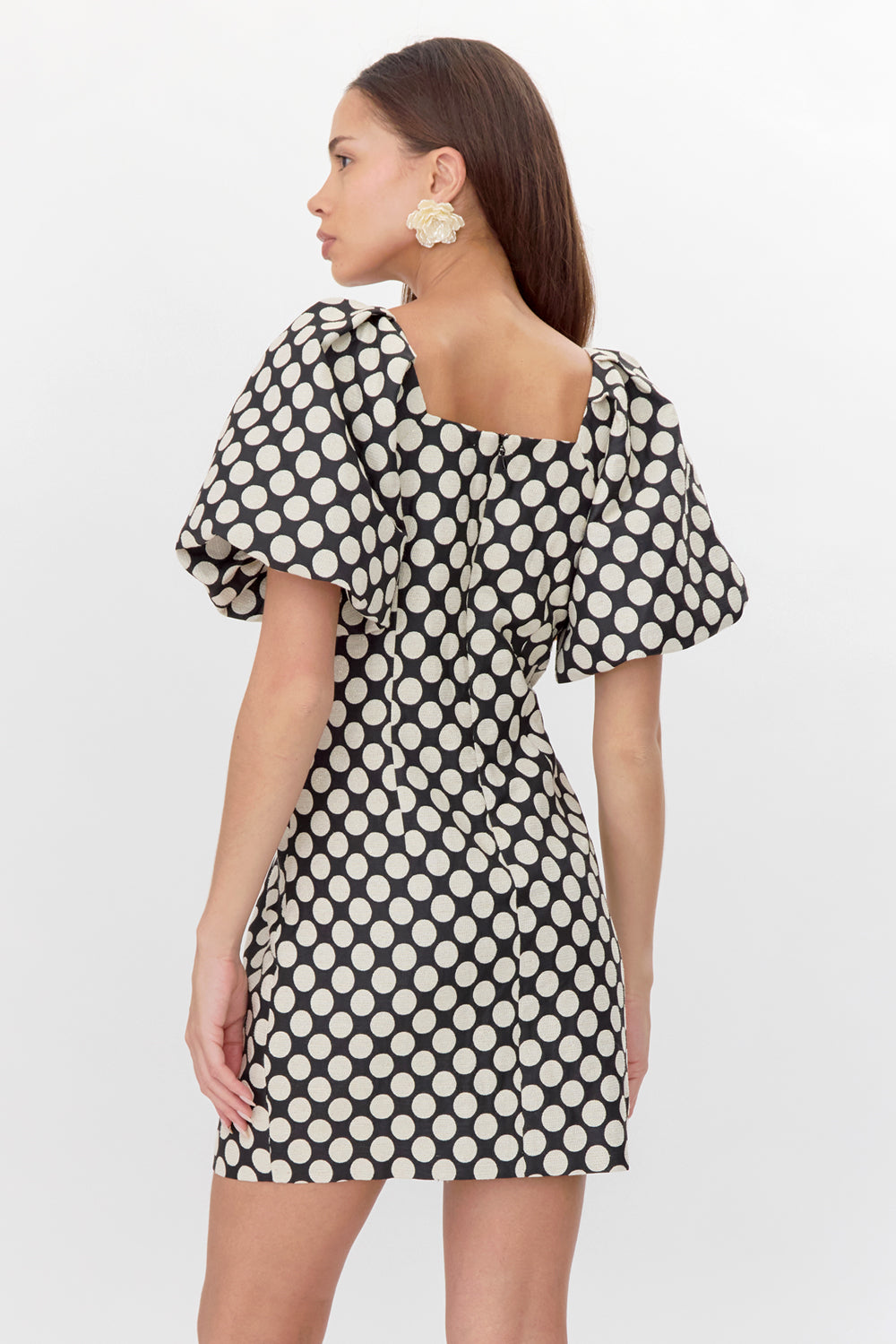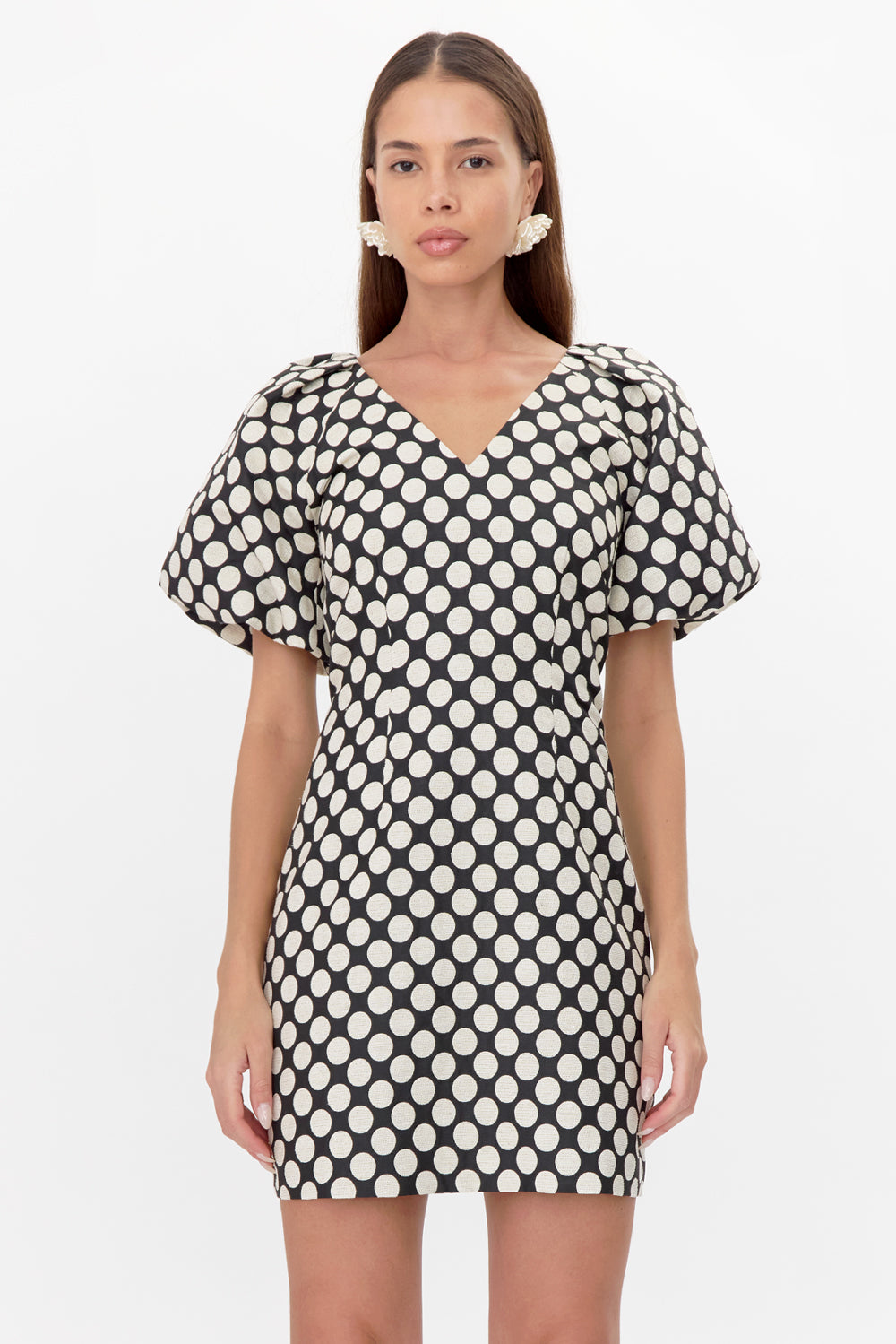 Polka dot mini dress defined by its bold, puffy sleeves. To balance the grand structure is a V-neckline Installed with a back zipper for easy access.
