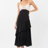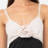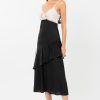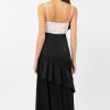 This romantic dress is adorned with a rose applique at the chest. Rendered in a black and cream color way, the “Zadie Dress” is perfect for an evening where making a statement is the standard. The skirt features an asymmetrical ruffle and the bodice is lined with tassels.