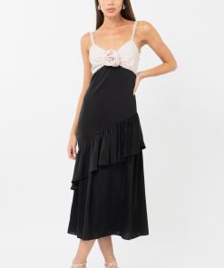 Adelyn Rae Women’s Zadie Asymmetrical Ruffle Midi Dress | Champagne & Black